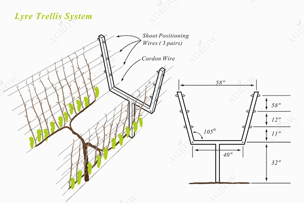 Das Lyre-Gitter-System, auch als „U“ -förmiges Gitter bekannt, ähnelt dem Genfer Doppelvorhang. Die Stöcke sind jedoch nach oben und nicht nach unten gerichtet. Der nach oben gerichtete Baldachin schützt die Trauben vor Schimmel, indem er mehr Wind und Sonne aussetzt.